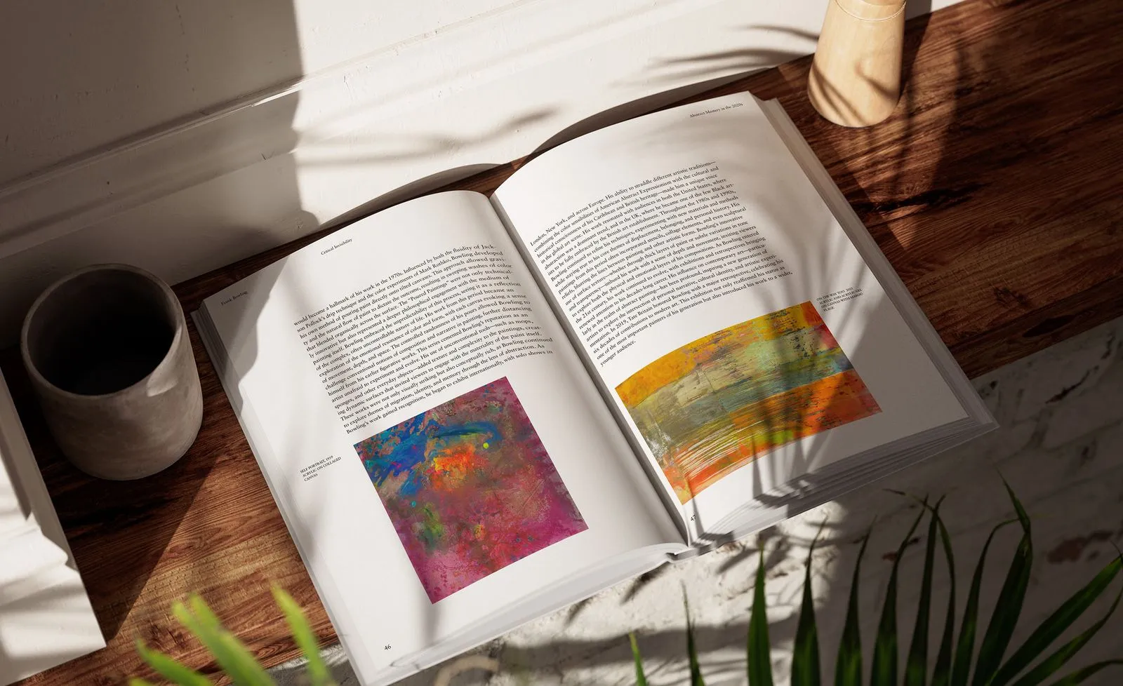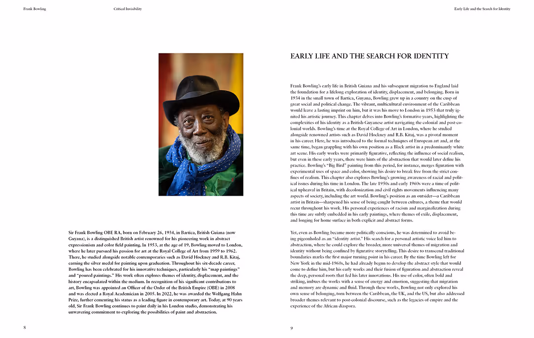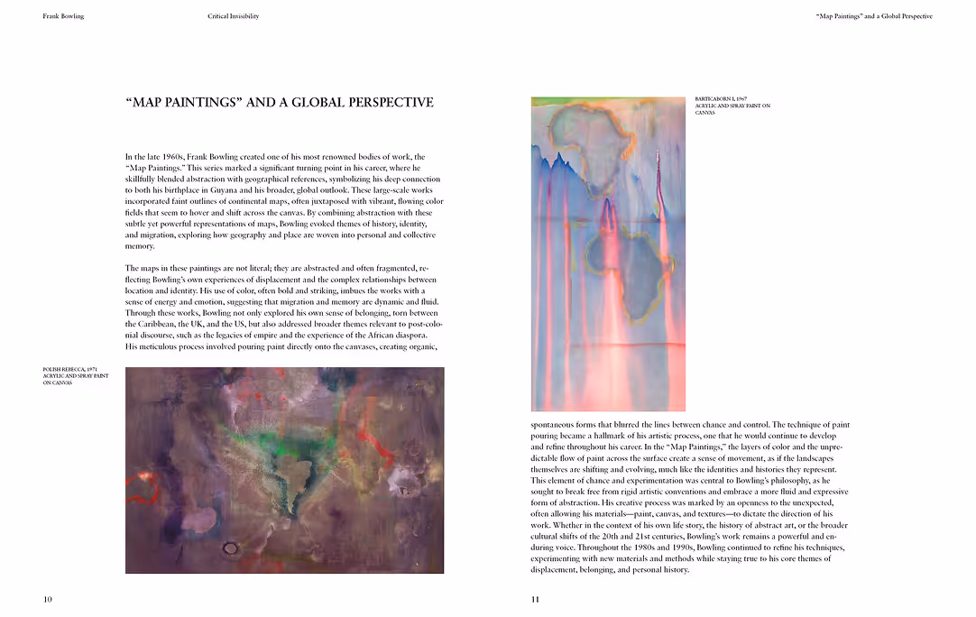 This project was an editorial design assignment focused on creating a book about the work of Frank Bowling, a British-Guyanese abstract painter known for blending personal history, geography, and post-colonial identity in his work. I designed both the cover and the layout, using Bowling’s art and themes as the foundation for all visual decisions.